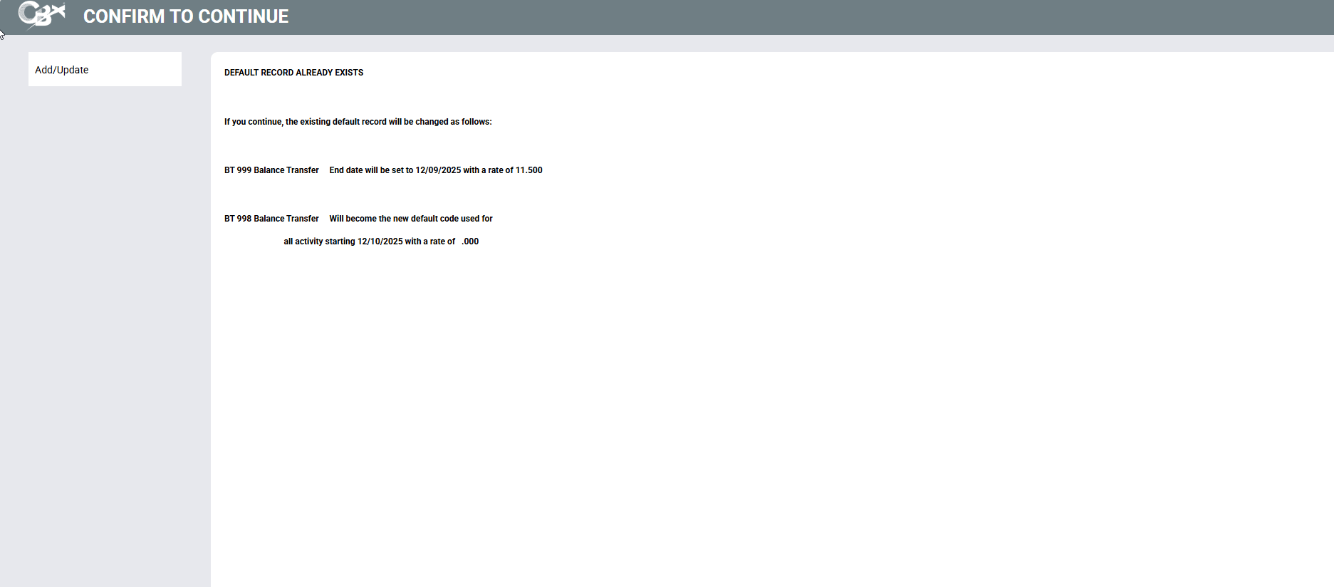 | Screen Title: | Default Rate Update Confirmation | |