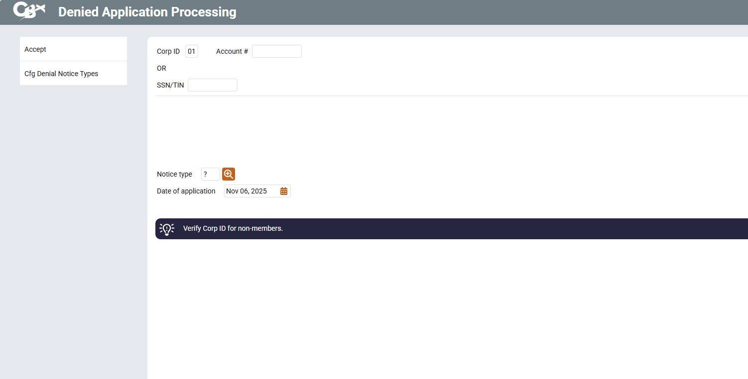 CU*TIP: When using these screens to deny a new membership (must click the Deny Membership button on the create membership confirmation screen), the core will automatically create a non-member record. If the denial notice is actually printed, the Deny membership flag will be checked on that new non-member record. The Denial type code used here will be recorded (showing the reason for the denial), as well as the date.