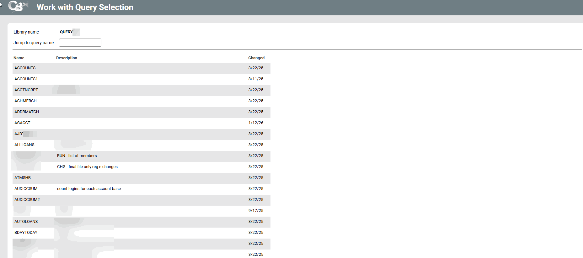 | Screen Title: | Work with Query Selection | |