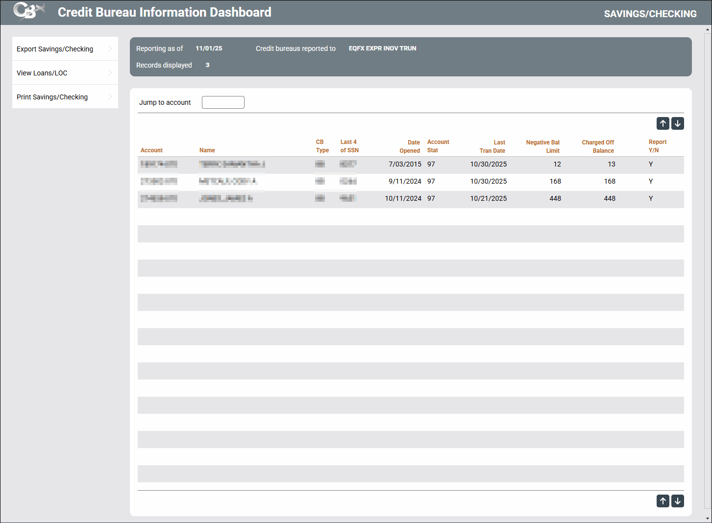This screen is used to view dashboards and print a report showing savings/checking or loan information that was sent most recently to the credit bureaus on behalf of your credit union.