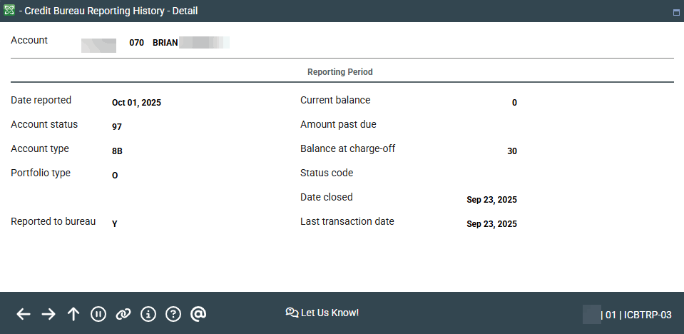 This window shows the details about this loan that were included when the loan (or savings/checking) account was reported to the credit bureau as of the Date reported. When done use Enter or Backup (F3) to return to the previous screen.