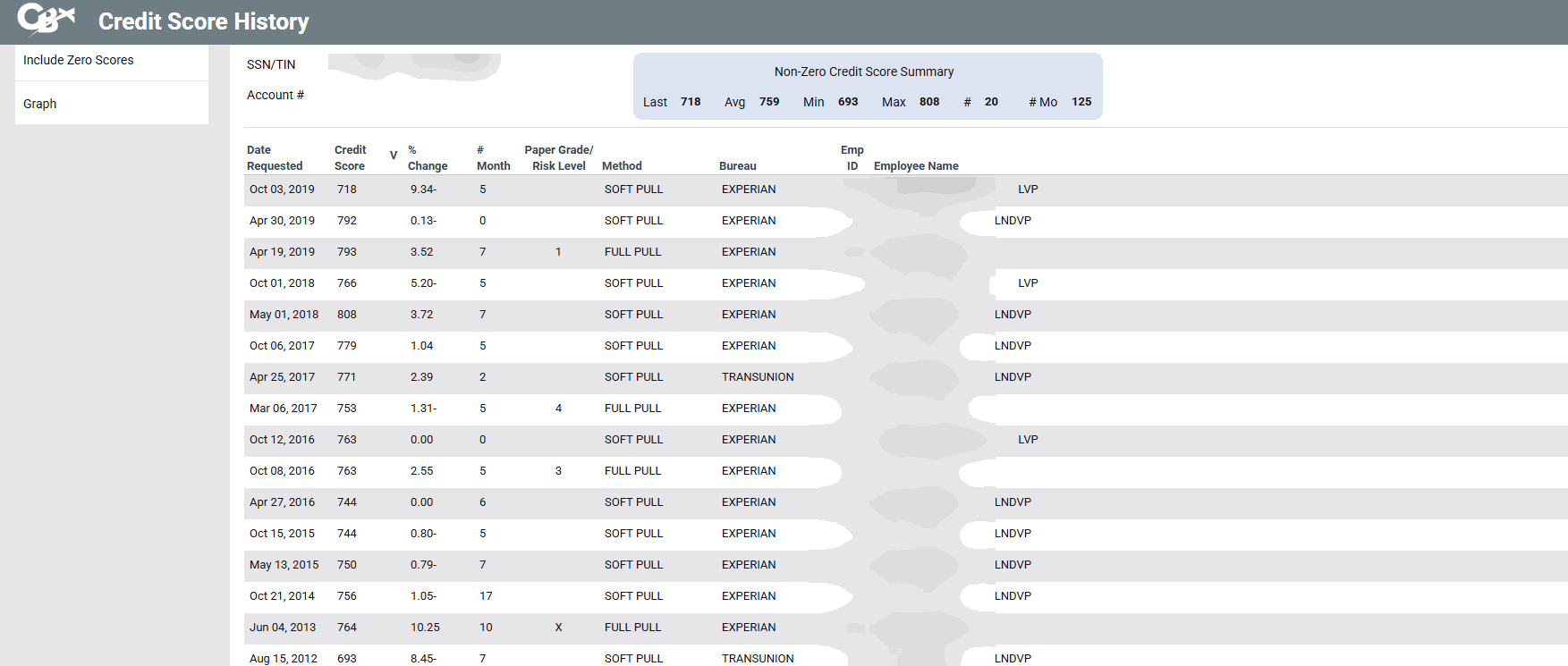 This screen lists all credit scores pulled for the selected Social Security number. This screen gets populated from the following processes: