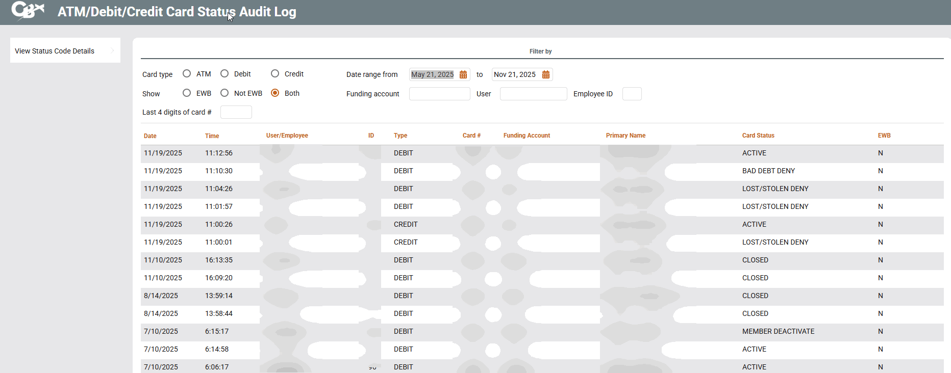 Also access this screen to show card changes for a single credit card by selecting the card on the Credit Card Maintenance screen and then selecting Status History. Access this screen to show card changes for a single ATM or debit card by selecting the card on the ATM/Debit Card Maintenance screen and then selecting Card Status History.
