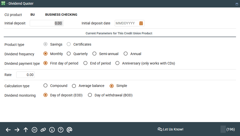 The Dividend Quoter tool is designed for two distinct groups: First, for the member service department, it is a tool to answer member questions about the quantity of dividends paid on initial deposit amounts such as certificates or a one-time savings deposit. While it is relatively easy to calculate the dividend, there are always variable controlling factors that make up how a dividend is paid and earned. For example, does the member earn for the day of deposit or the day of withdrawal? What is the frequency of the dividend payment? Does the product use a compound or simple accrual method? These are all factors selected and controlled by the credit union's management through core configuration screens. They are not factors that are always clearly related to the front-line personnel. This product will verify those decisions and through answering member questions about dividends earned, the member services personnel will better understand how credit union products work.