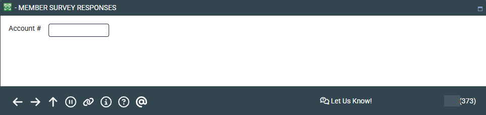 Use this screen to begin recording a members response to a survey. Enter the member's account number and press Enter to advance to the next screen.