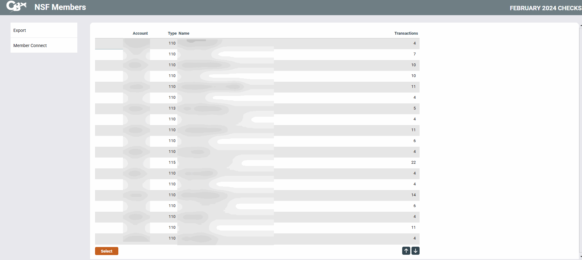 This screen lists the members who fall within the criteria entered on the previous screen. Use Export to create a file of these members for use with Report Builder (Query) or Member Connect to create a list of accounts to send these members emails or online banking messages through Member Connect.