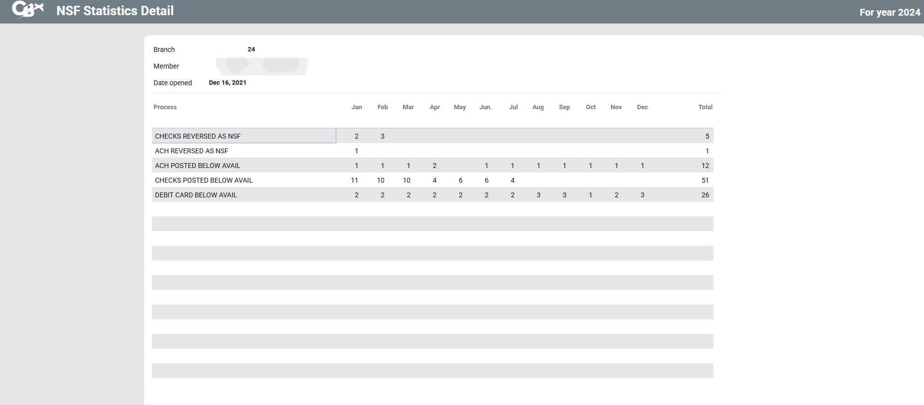 This screen breaks down NSF items by process, separating items that were actually returned as NSF from those that were not returned but were posted to a negative balance.