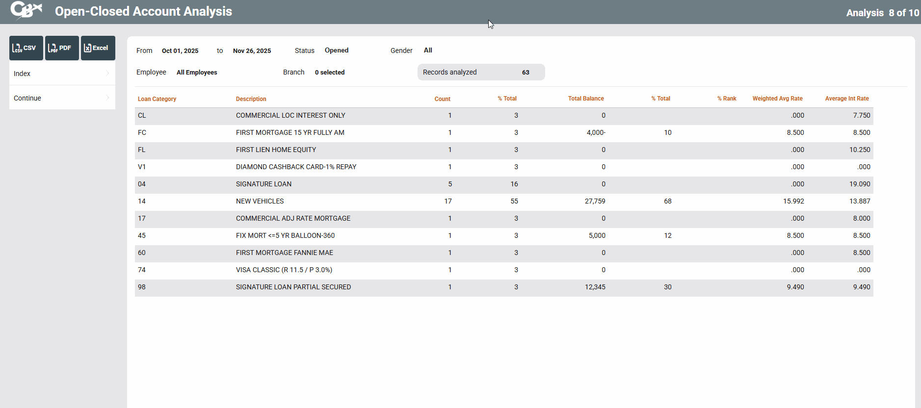 This is the eighth of the New-Closed Account Analysis Dashboards, the Lending” dashboard. Use this analysis to view data on the accounts you selected on the entry screen.