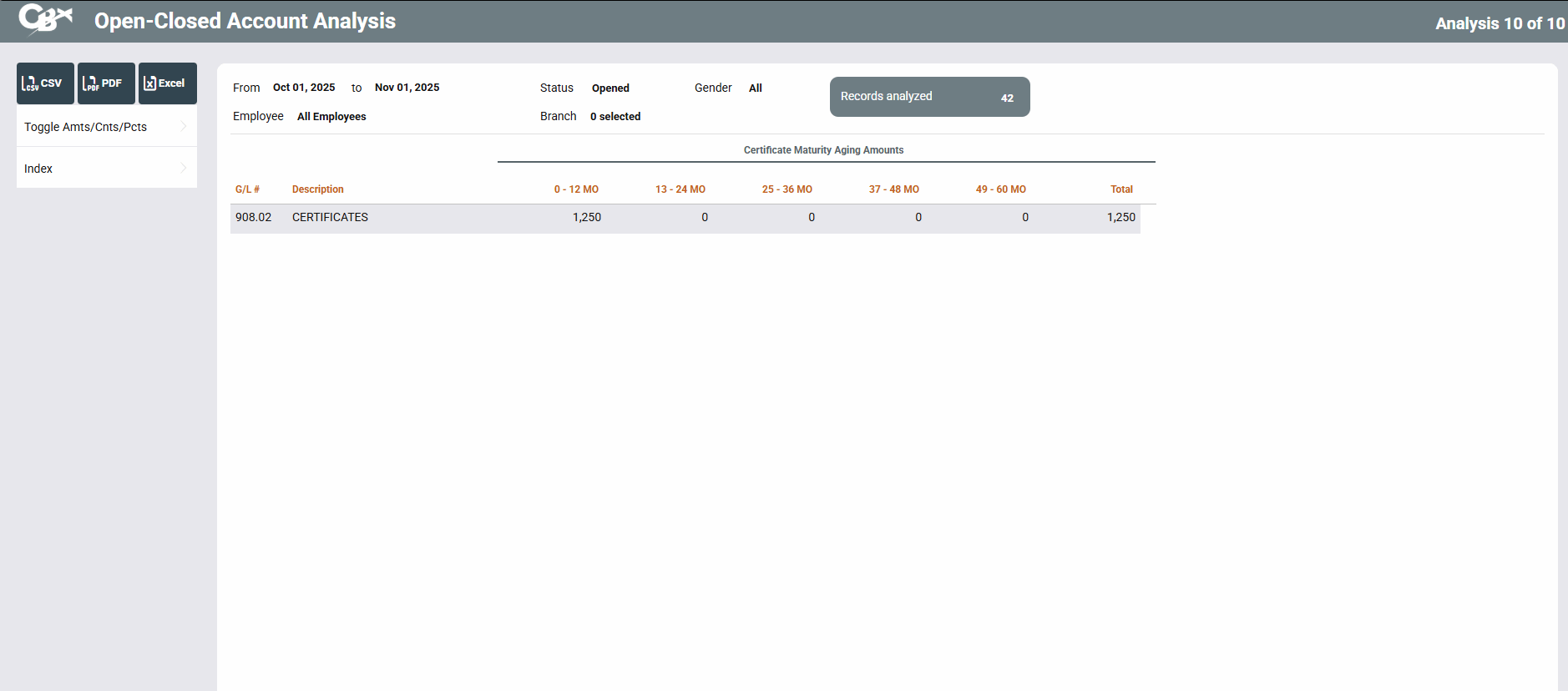 This is the final New-Closed Account Analysis Dashboards, the “Certificate Maturity” dashboard. Use this analysis to view data on the accounts you selected on the entry screen.