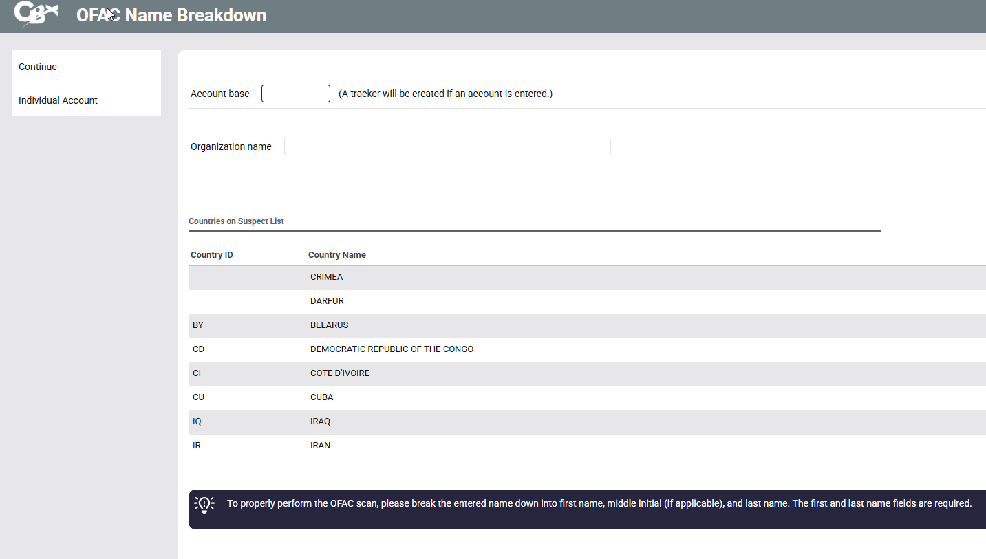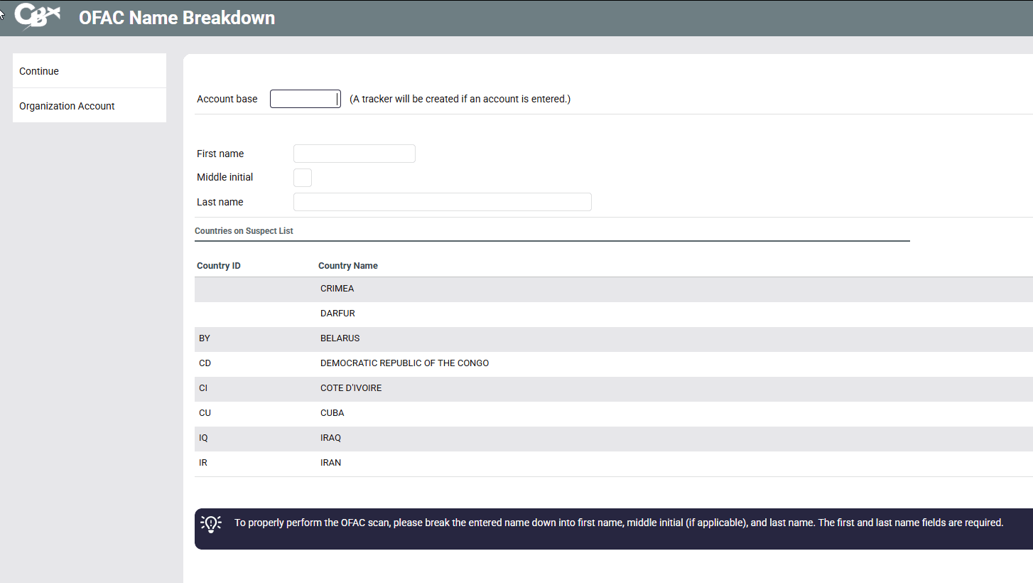 This screen allows you to confirm that the information entered in the field(s) on the screen to be scanned is correct before running the OFAC scan. You may need to enter the name or organization, depending on how you access this screen. There are two versions of this screen, one for scanning a person's name and the other for scanning an organizational name. The name version contains three fields (first name, middle initial, and last name) while the organizational version only contains one field. To change between the versions, use the toggle button on the left.