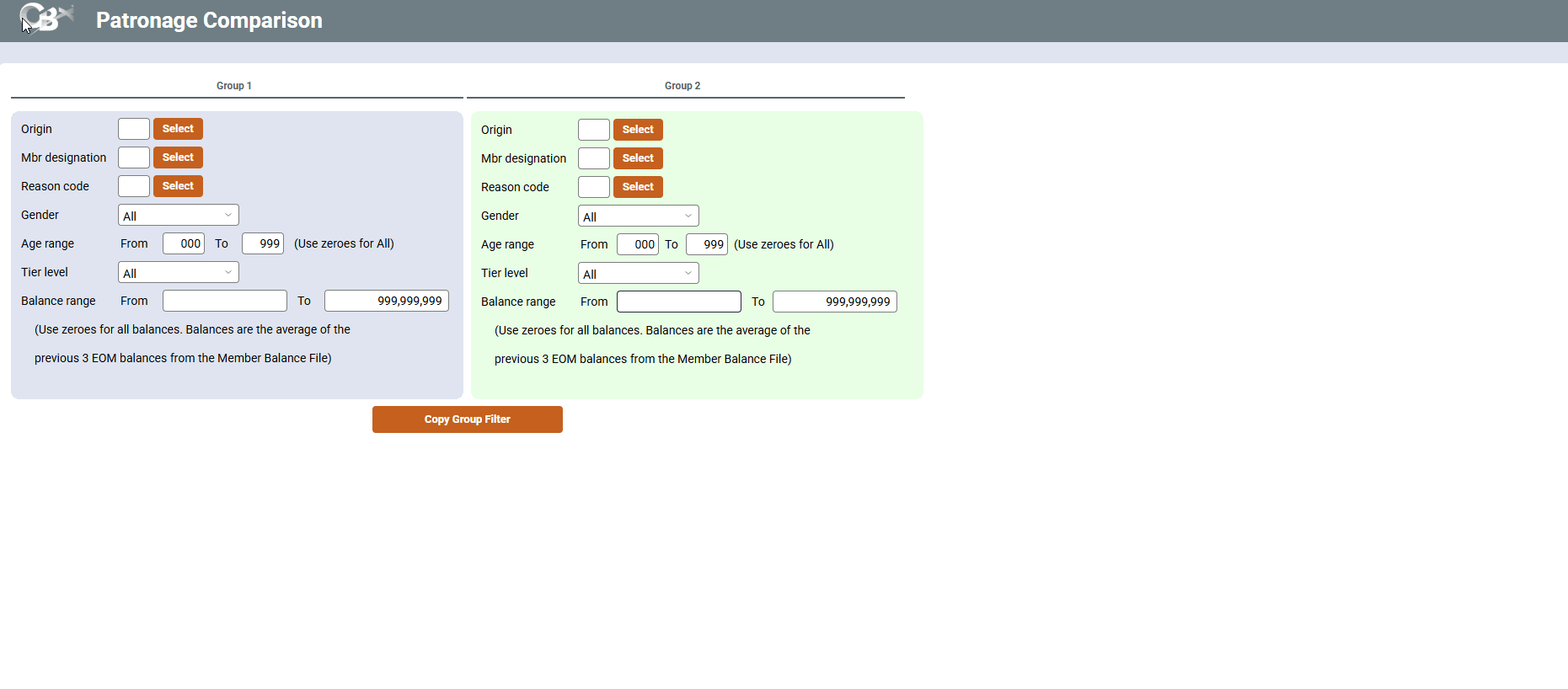 Enter a balance range to narrow your group. Use zeroes for all balances. Balances are the average of the previous 3 EOM balances from the Member Balance File (MBRBAL). This file takes a snapshot balance as of month-end. |
