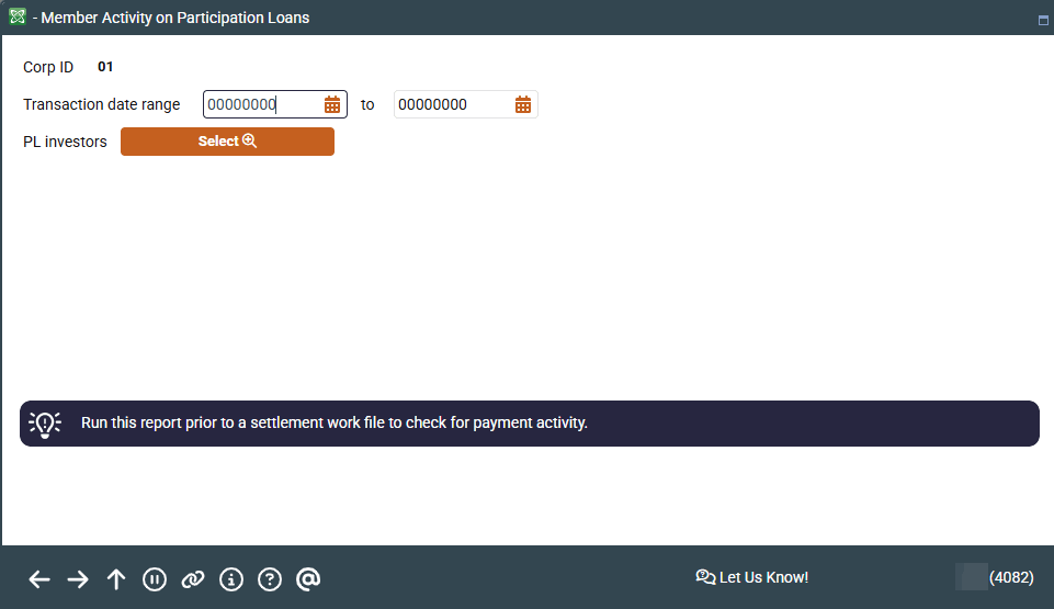 This is the selection screen to view member transaction activity for participation loans. A transaction date range is selected along with one or multiple PL investors. This inquiry can be run using any date range but will only provide activity if transactions exist on the member transaction files. The prior 12 months of member activity is available.