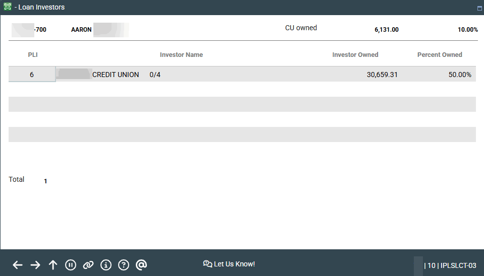 View a listing of the Participation Loan Investors associated with this loan. View the current balance on the loan, as well as the percentage that the investor owns and the credit union percentage.
