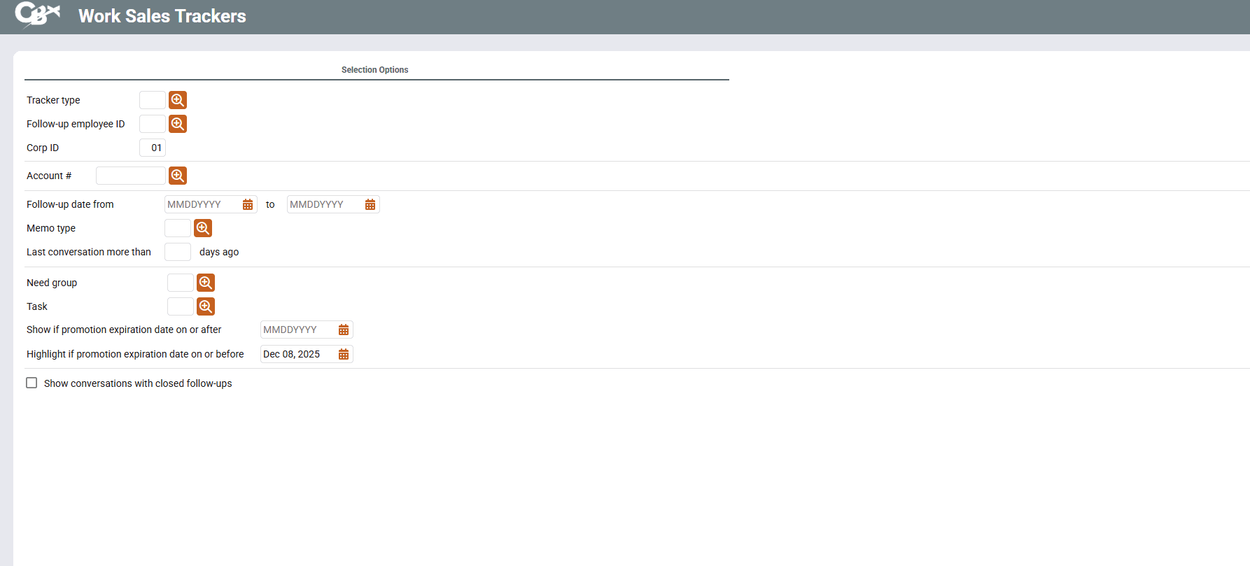 Use the search fields at the top on the screen to locate a specific member account, view all leads flagged for a specific telemarketing representative (Employee ID), Corp ID, or to display only trackers that fall within a certain range of dates. You can also narrow your select by Memo Type, last conversation type, Need Groups, or Task number. You can select to see only Trackers on or after a specific promotion date and also highlight trackers on or after a selected date. Finally, you have the choice to choose only conversations with closed follow-ups.