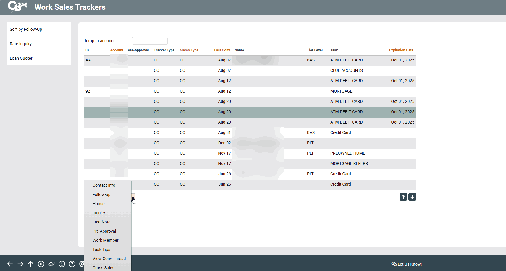 This takes you to a screen where you can select the member's Sales Tracker. From this screen, you can select the option key Update to work this sales lead and document the member's response. |