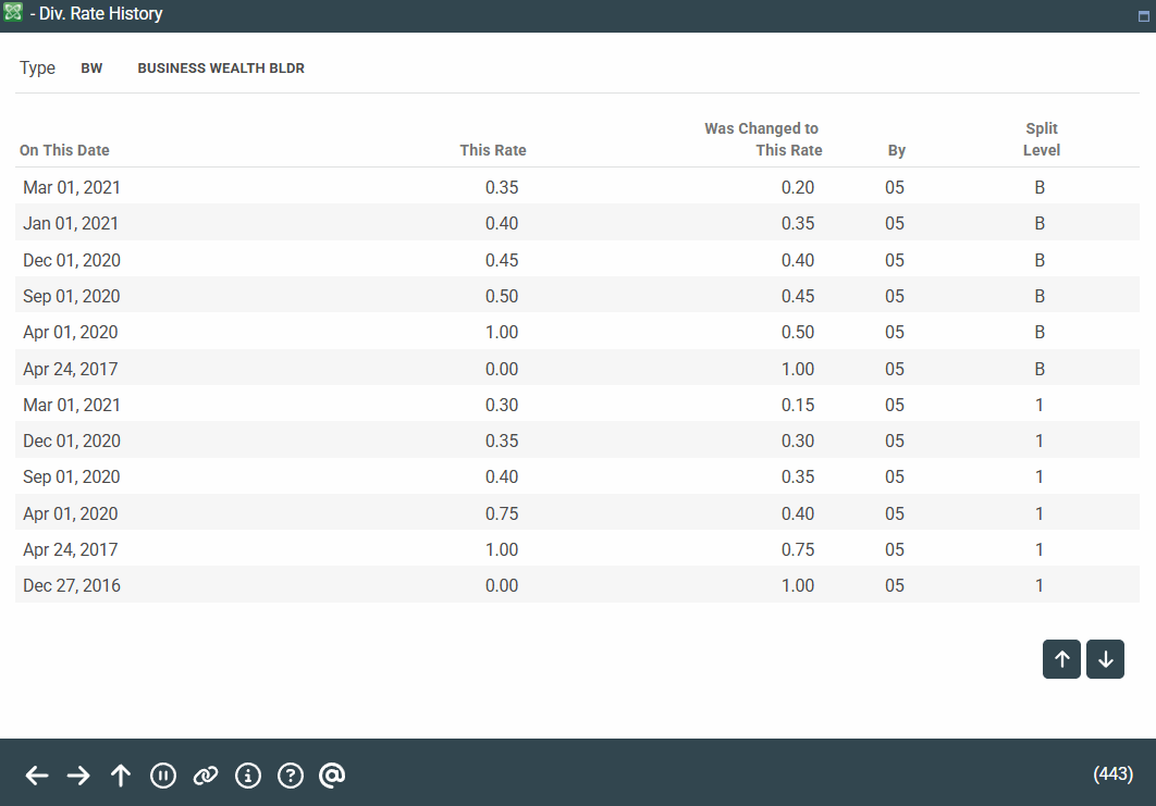 This window appears when you use History on the Share Rate Inquiry or selecting the history icon on the Share Rate Maintenance screen. (This screen is used for CD Rate History.)