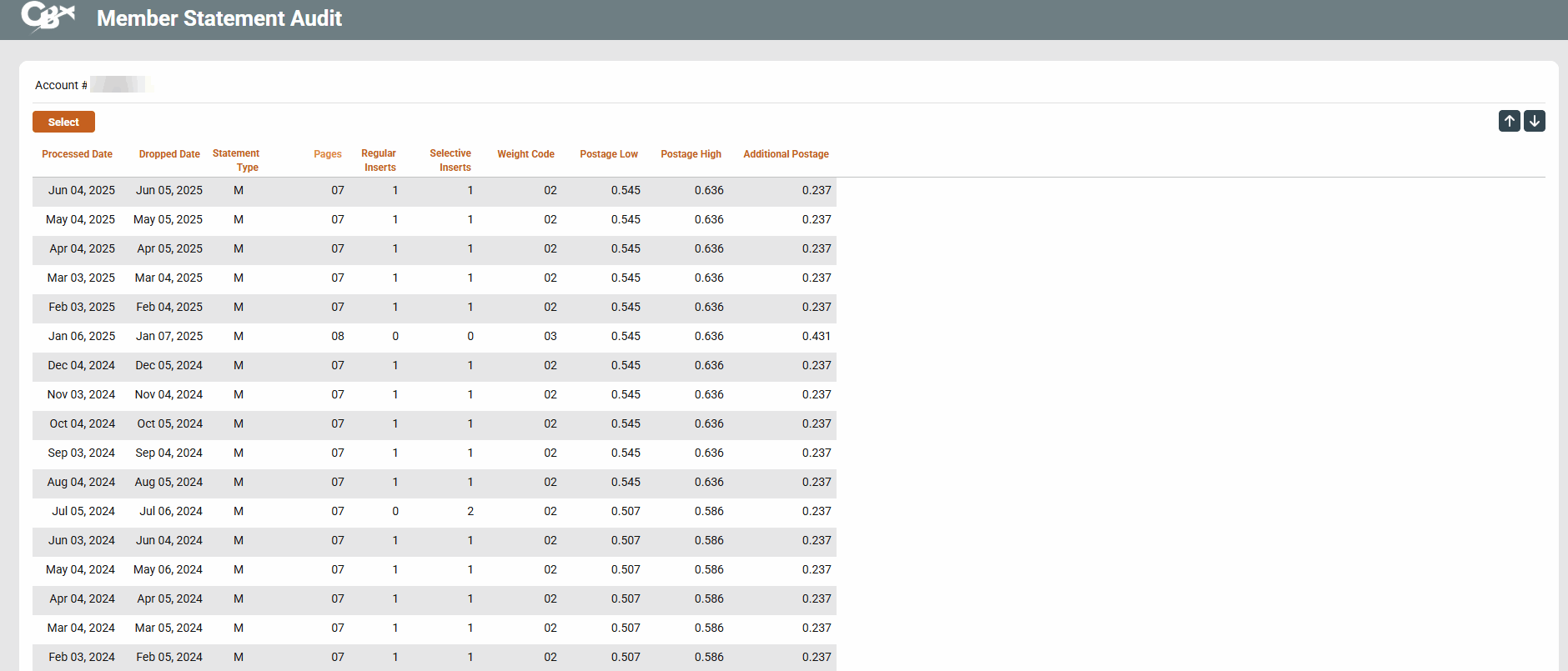 This screen displays a record for each statement that was processed and mailed to this member by Sage Direct. You'll be able to see the number of pages printed, number and type of inserts included, total package weight—even the date when a member's statement was dropped at the Post Office! This feature should be a great help at the beginning of the month when members start calling about their statements.