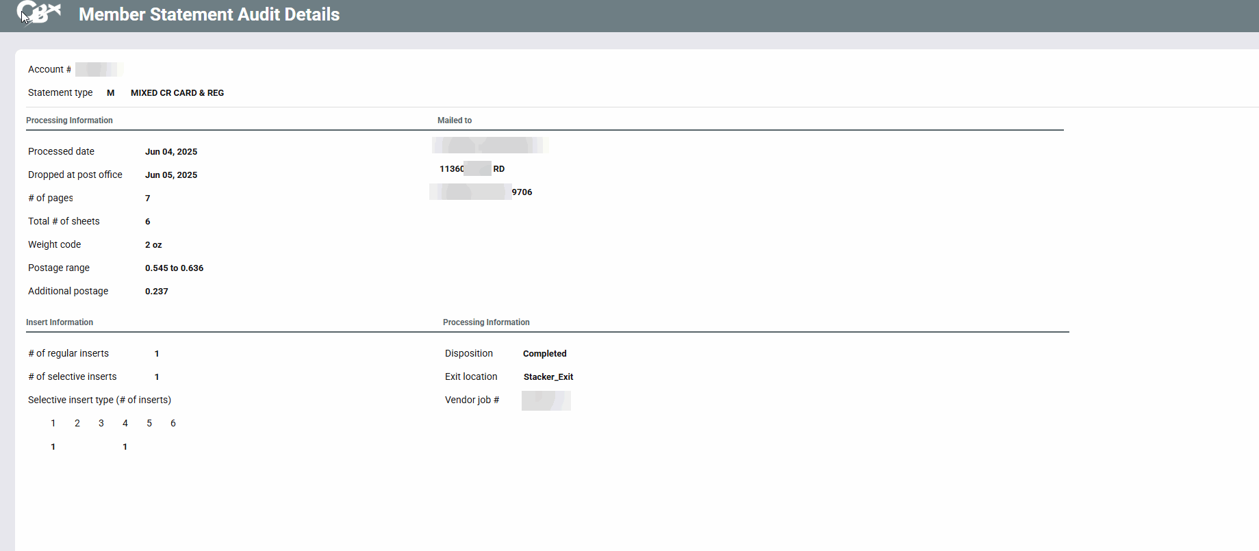 This screen shows more details for the statement record selected on the previous screen. You will be able to see specific details about the member's statement mail piece and how it was processed for this particular mailing. See below for a description of each field displayed. Data for this inquiry comes from file STMAUDIT which is updated on a monthly basis after statement processing is completed.