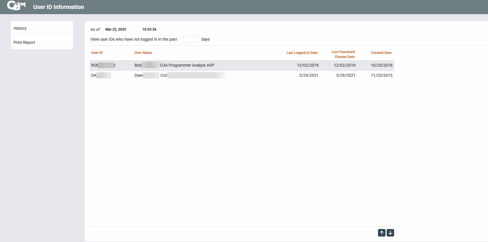 The User ID Inquiry lists User ID information for the credit union, including the Last Logged in Date, Last Maintenance Date and Last Password Change Date. Credit unions can also enter a # of days since login to view employees who have not logged in for a period greater than this number of days.
