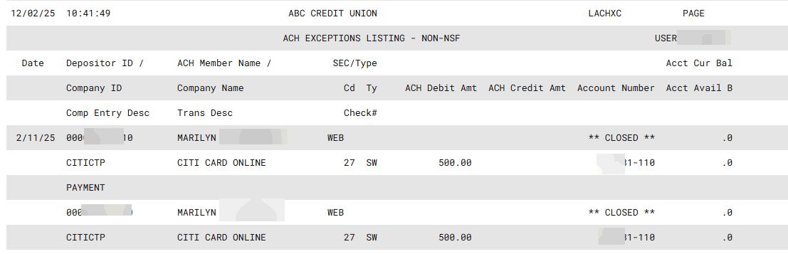 ACH Daily Exceptions Report