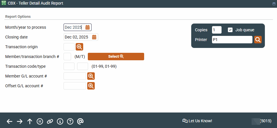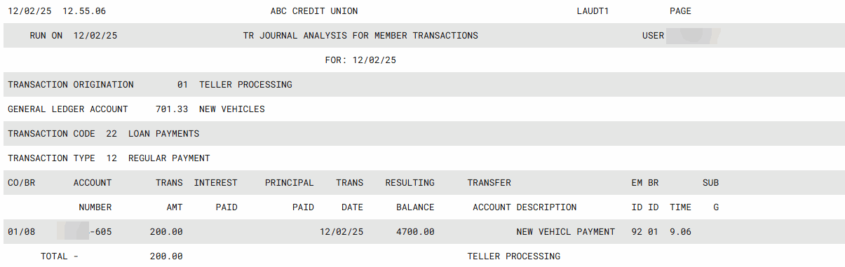 This is different from the G/L Interface Trial Balance report (LGLTRE, commonly called the “TR”) because the Teller Detail Audit Report provides complete detail of every member-related transaction, without summarizing. This report provides the support documentation for the summary balances on the TR. It can also be helpful for researching the offsetting G/L accounts for member transactions.