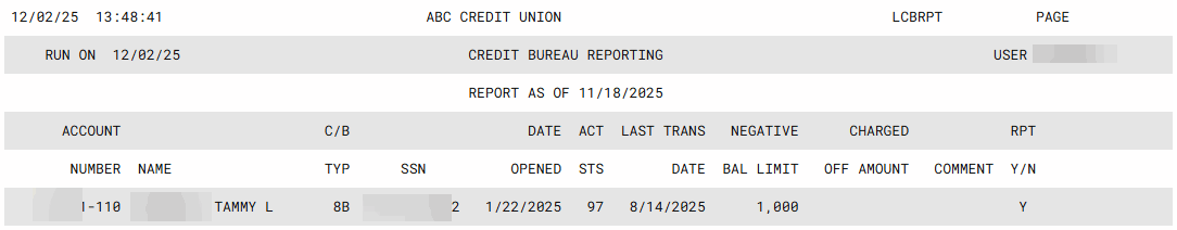For example, if your credit union reports to the bureaus every month (as most do), this report will reflect the information that was reported at the beginning of the current month. Credit bureau tapes are generated during the first week of the month for online credit unions.