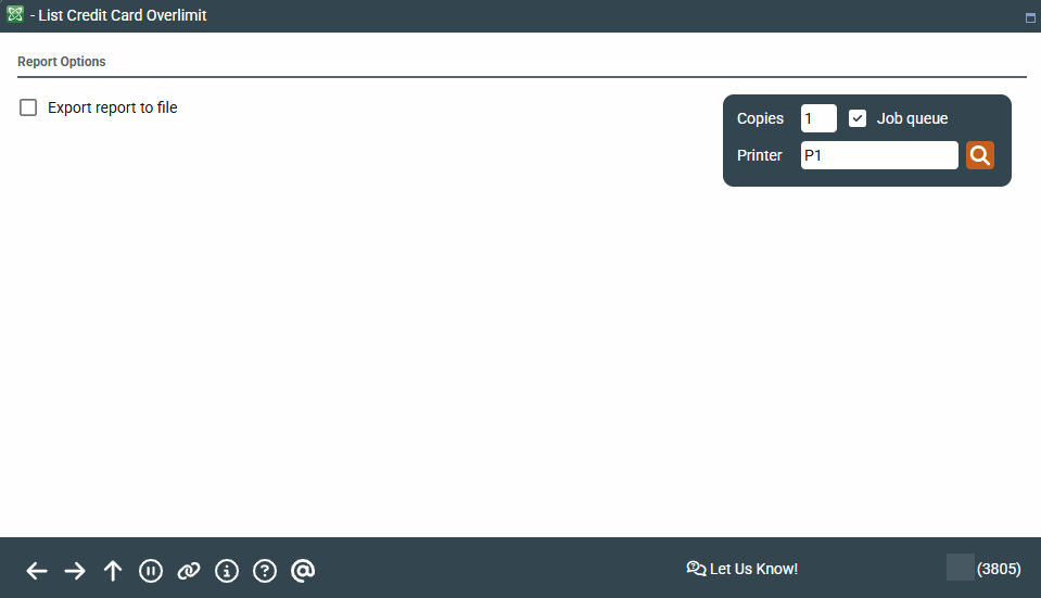 This screen allows create a report listing overlimit credit cards. Check the box next to Export report to file to export the data for use with Member Connect or Report Builder (Query). You can also select the printer to which you wish to print the report.