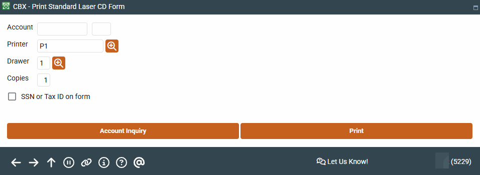 This screen is used to print a standard CBX laser certificate form. Forms are credit union-defined. For information about configuring and printing CD forms, refer to the User-Defined Laser Certificate Forms booklet.
