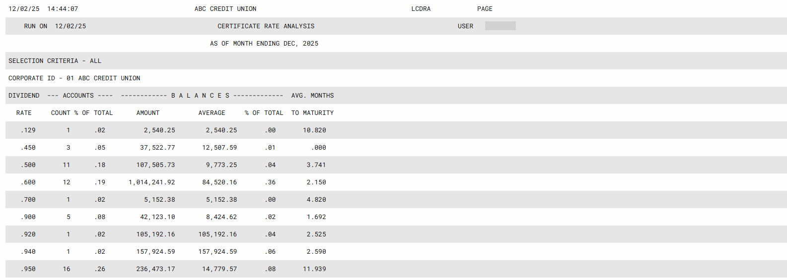 Similar to the Loan Interest Analysis report, this report lets you see how your current certificate accounts are currently priced and is helpful for planning upcoming rate changes.
