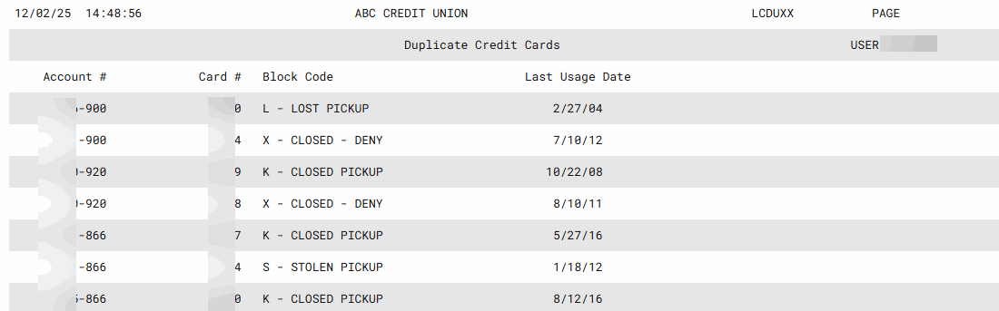 This creates a report listing duplicate credit cards (all cards that have a card status of "Duplicate" (D), meaning the card is an old card and the loan has been reissued a new card number to replace this card). This is an informational report that can be printed when needed for research purposes.
