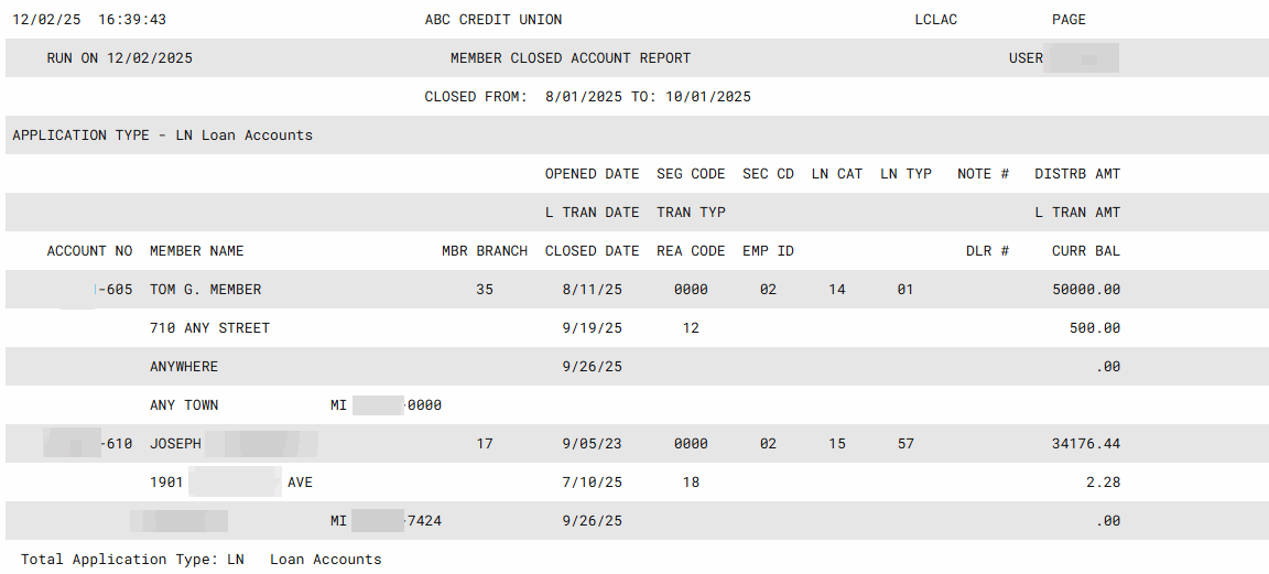 Use this report to monitor closed member accounts. This report tells you at a glance which accounts have closed along with the date and amount of the final transaction. On the right, the Reason Code for the account closing is listed giving you immediate feedback into the reason for the account closing.