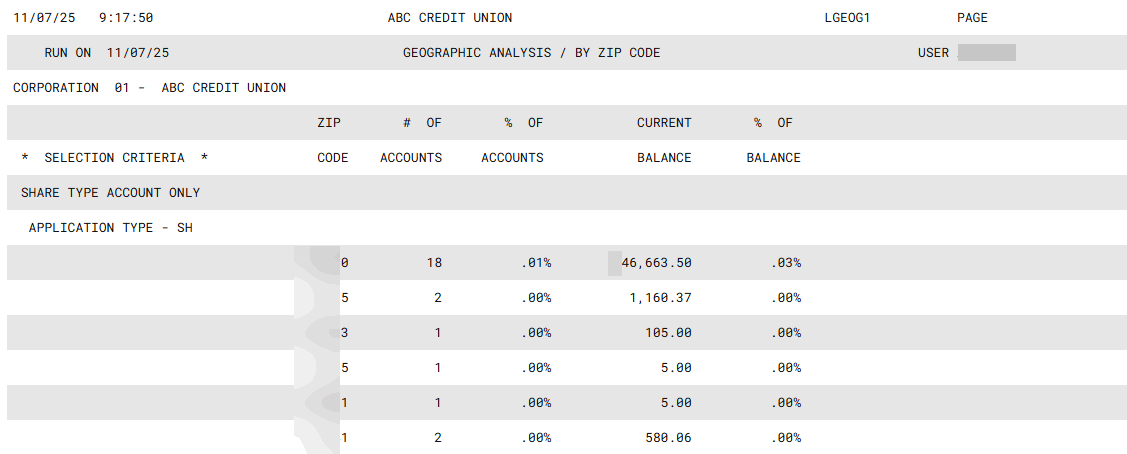 This screen is used to print a report that analyzes your sub-accounts geographically, by using the ZIP Code on the member's MASTER record. Are there certain neighborhoods in your community to which your newspaper or radio marketing efforts should be targeted for the most “bang for the buck?” Use this report to get ideas for a more targeted marketing approach.