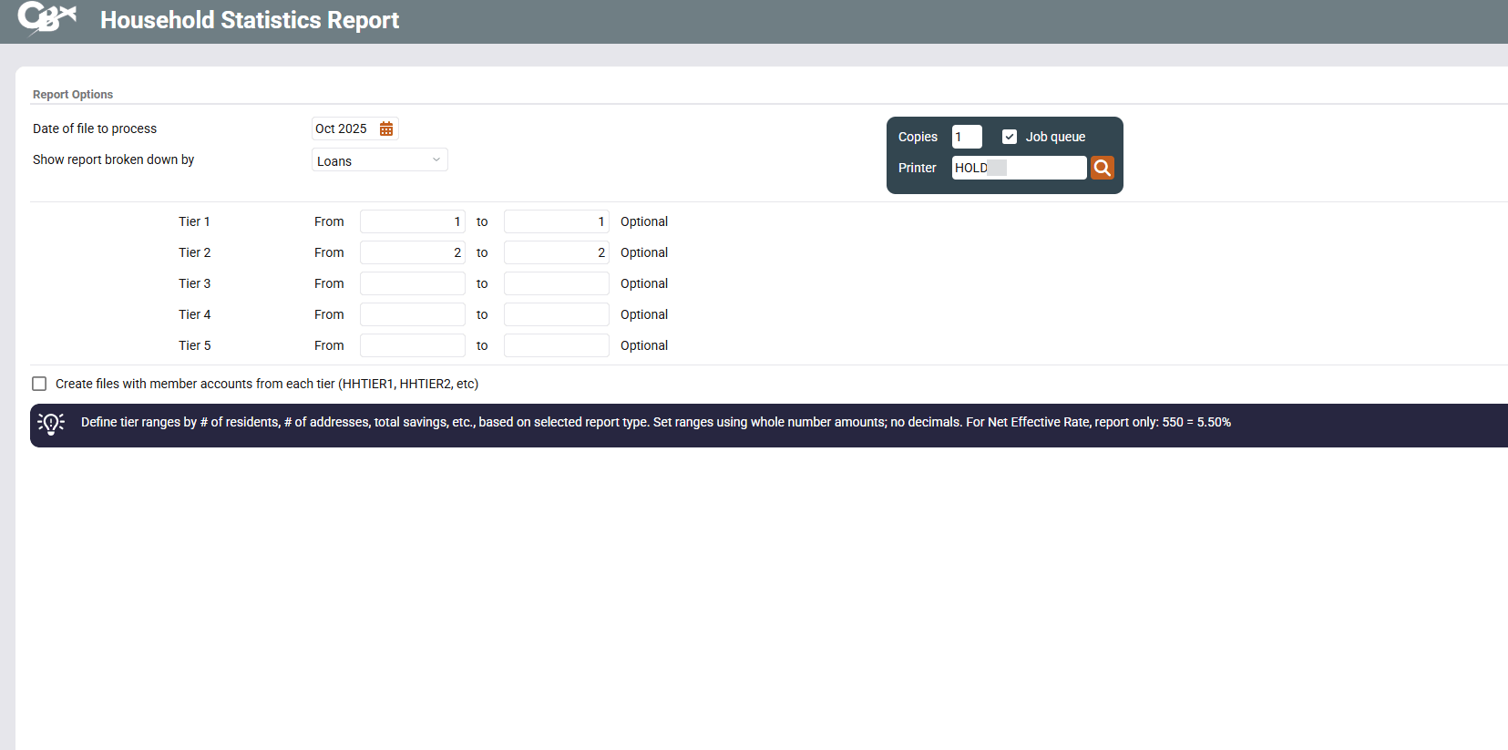 For instructions on using this screen to choose a report format and define tier ranges, or to see samples of the printed reports, refer to the Household & Member Statistics booklet. This booklet also describes how you can use the Create files with member accounts... option to create a series of database files that contain the actual account numbers and household numbers for the members represented by each tier.