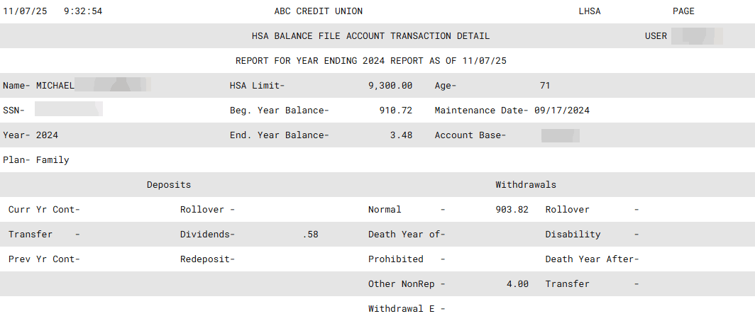 This reports shows detailed information about a member's balance file and HSA transaction activity. This report is helpful for researching HSA balance file discrepancies and confirming that all transaction activity has been properly coded for tax reporting.