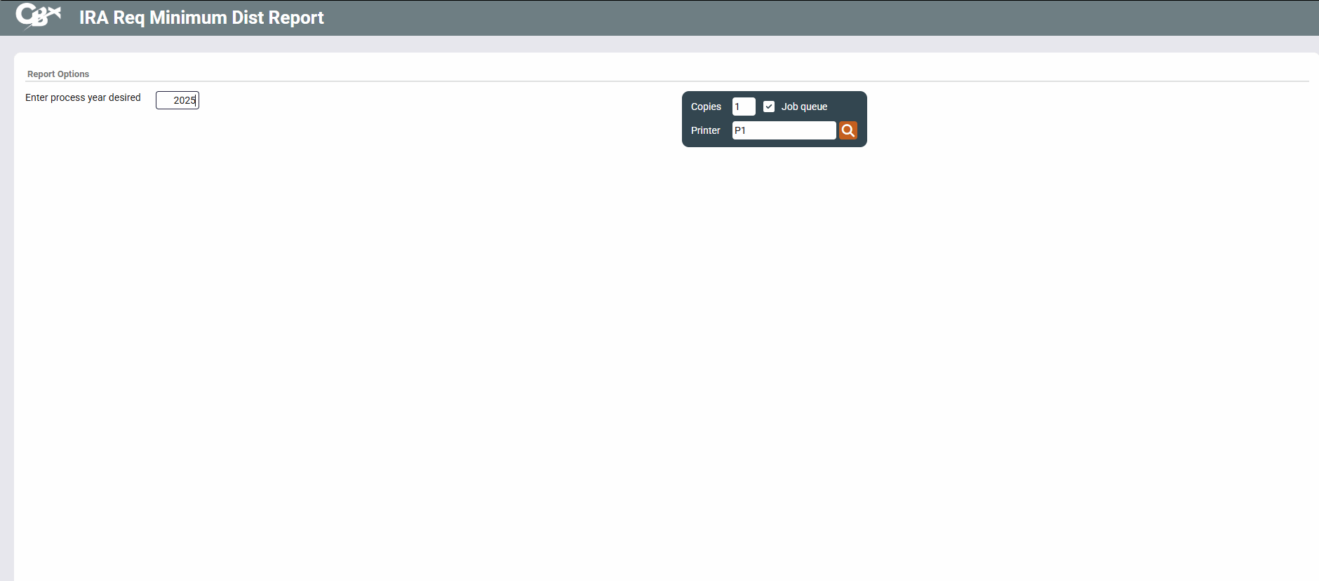 Access this screen by selecting Tool #416 IRA Req. Minimum Distribution Report.