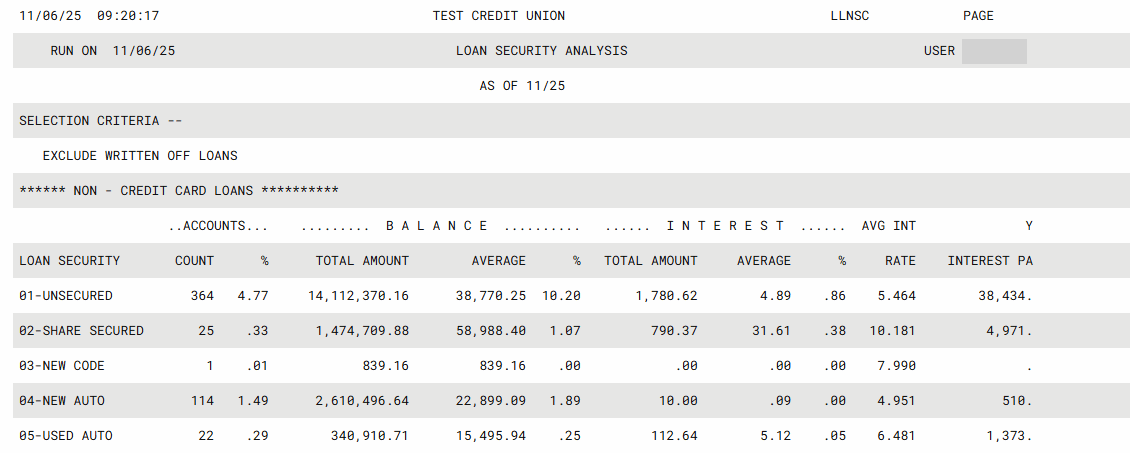 Access this screen by using Tool #474: Loan Security Code Analysis Report.