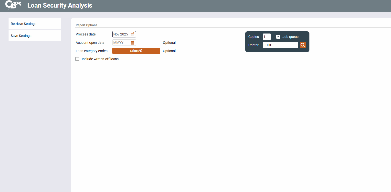 Use this to generate a report of all open loans by how the loan was secured. See Configuring Loan Security Codes. You can also select to include written off loans as well by checking the appropriate box, and this may be helpful to obtain your charge-off information for your 5300 Call Report.