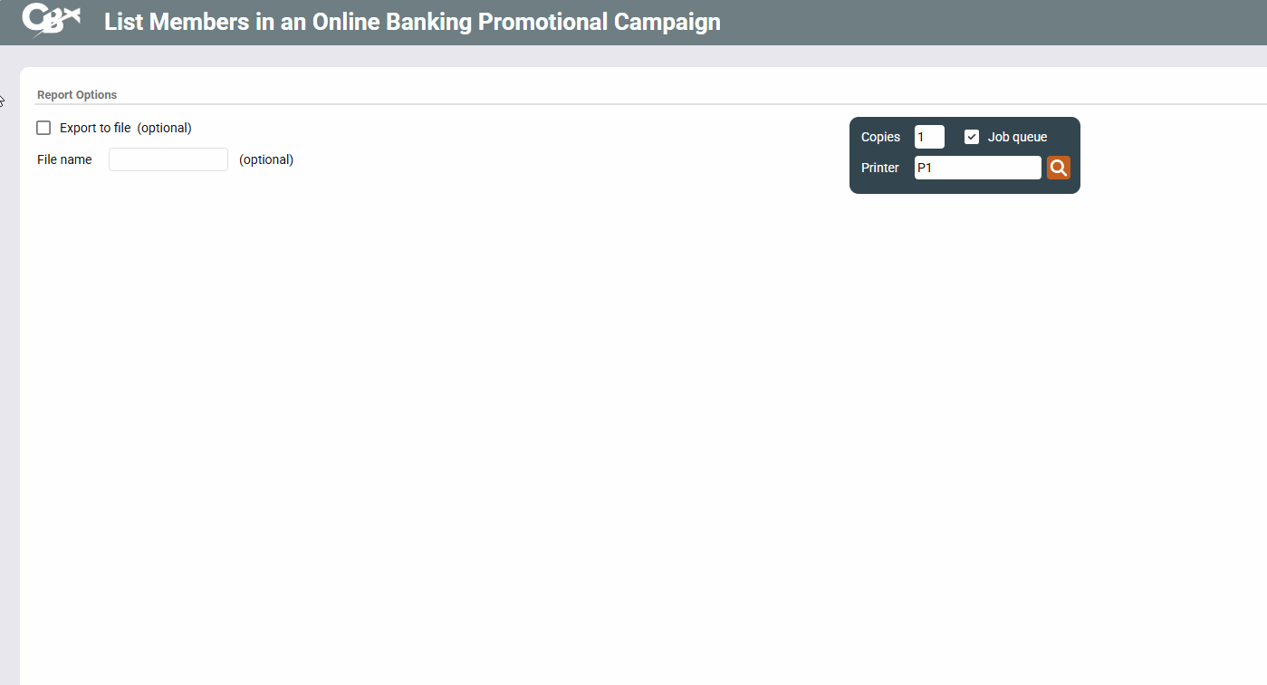 Use this screen to create a file of the members included in the promotional campaign for use with Member Connect. To create the file, check the Export to file checkbox and enter the file name.