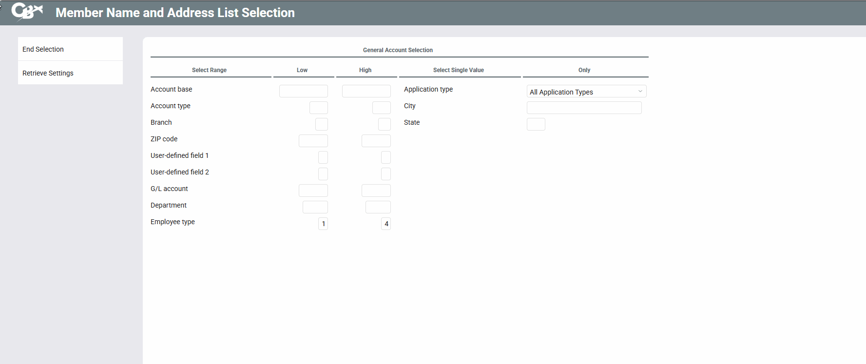 On this screen, you may narrow down the list by specifying ranges for various settings such as Zip codes or branch number. You may also choose to select just a single application type, city, or state.