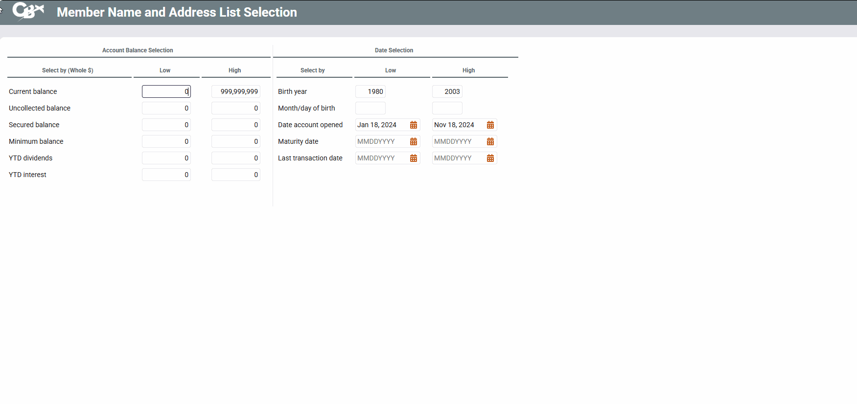Date Selection For these fields, specify both a low and high date to include only members whose accounts fall within those date ranges. |