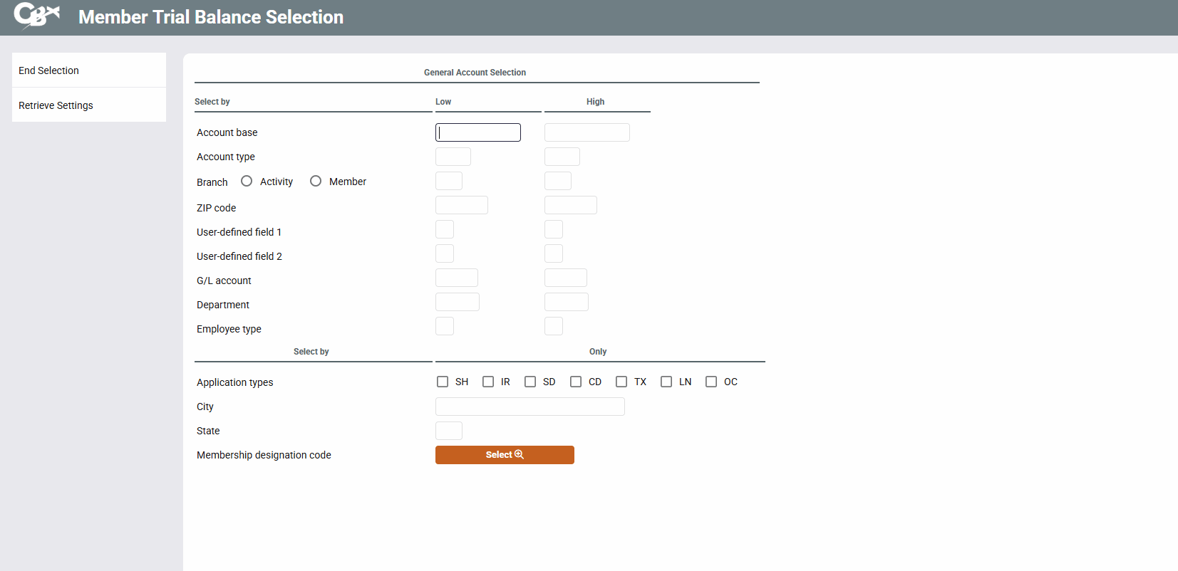 On this screen, you may narrow down the list of members by specifying ranges for various settings, such as ZIP codes or branch number. You may also choose to select just a single, product type, city, or state.