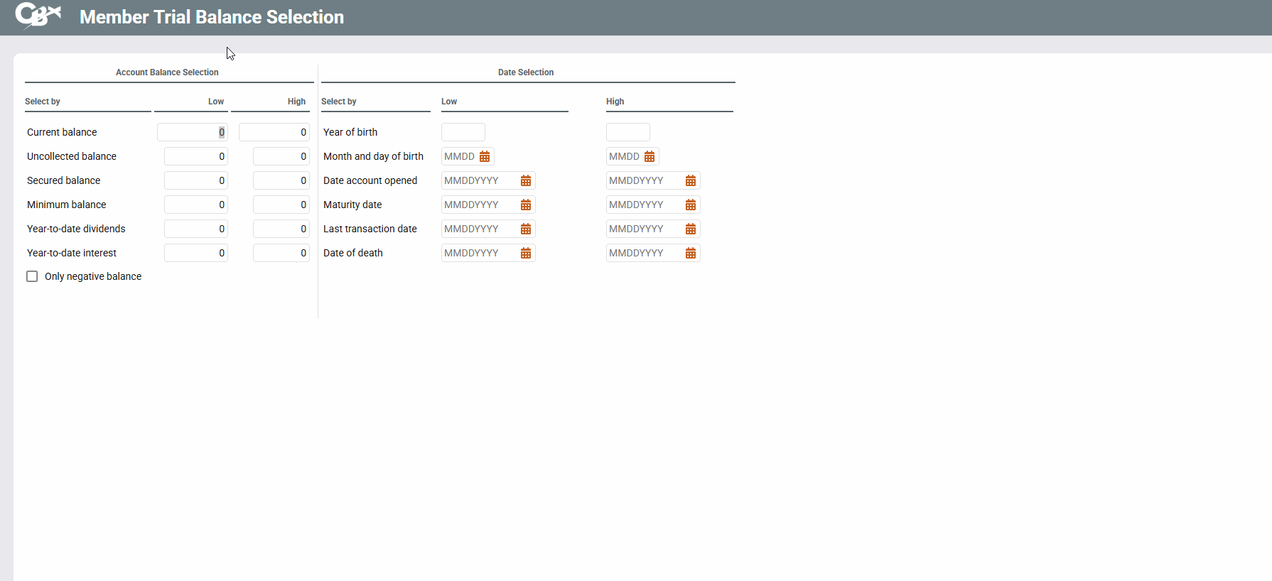 Account Balance Selection For these fields, specify both a low and high amount to include only members whose balances fall within those ranges. |