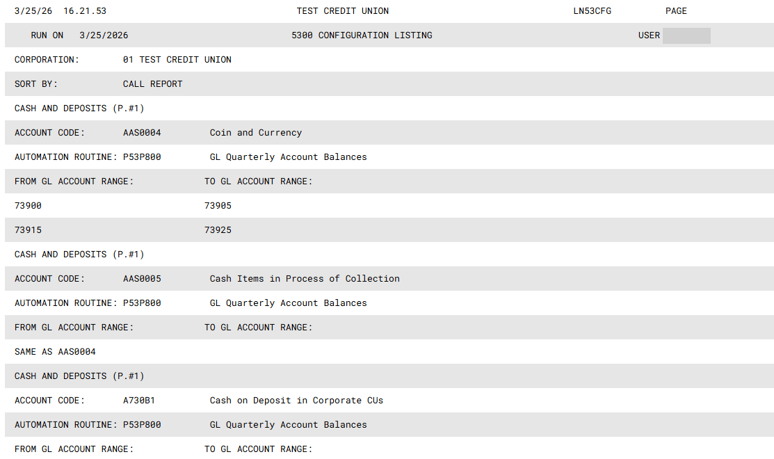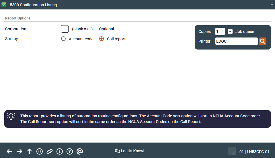 This report provides a listing of your credit union’s current automation routine configurations, including G/L accounts, purpose codes, security codes, or category codes and prints in Account Code order. Select a Corp ID or leave the field blank to include all Corp IDs and select whether to sort by Account code or Call report (the default). Press Enter to run the report.