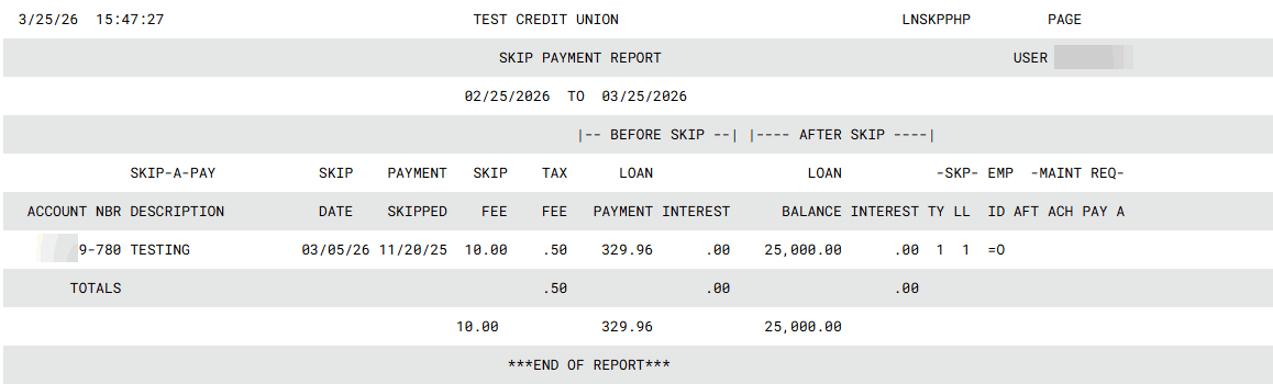 Data on your members who skipped a payment for your consumer skip-pay programs is available on a printed report that can be access from this screen. Learn more about consumer skip-pay programs.