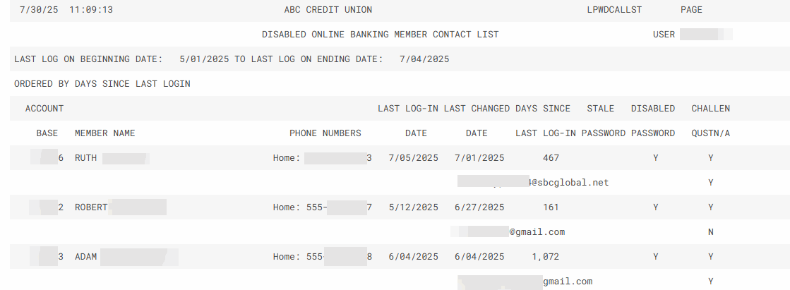 As a companion to your dormancy monitoring, you can now monitor stale or expired online banking passwords using this report, which lets you specify a range of “last login dates” (for example, to include members who last logged in more than 90 days ago).
