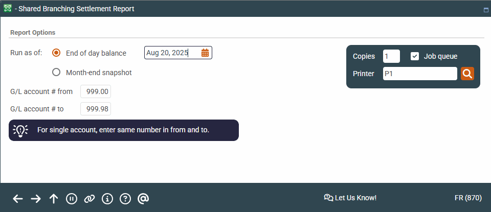 Access this screen by selecting Tool #681: Print Shared Branch Settlement Report.