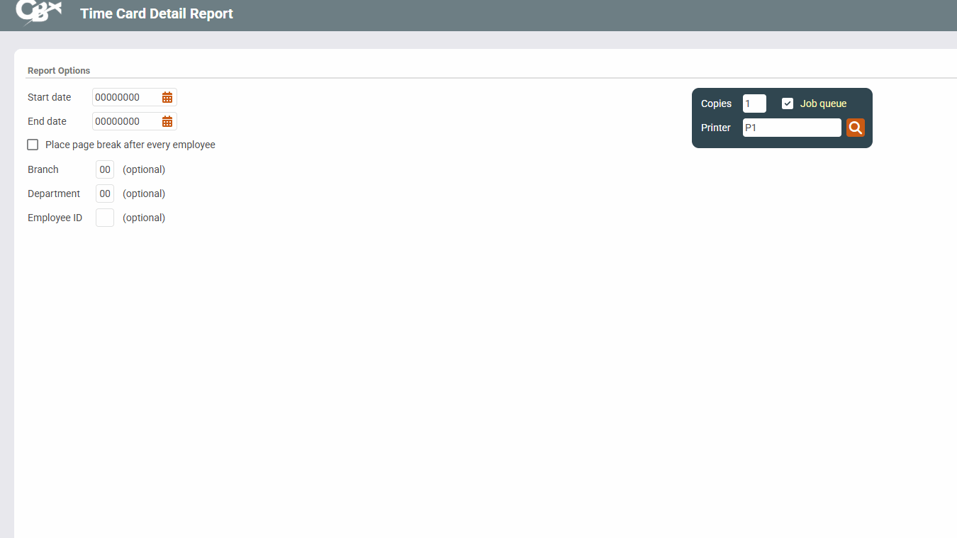 In this case, branch means the branch # entered by the employee on the Time Card Entry screen. (This may or may not match the branch/vault # assigned to the employee profile in Employee Security.) Department number is also taken from the time card record, as entered by the employee (this field is optional).