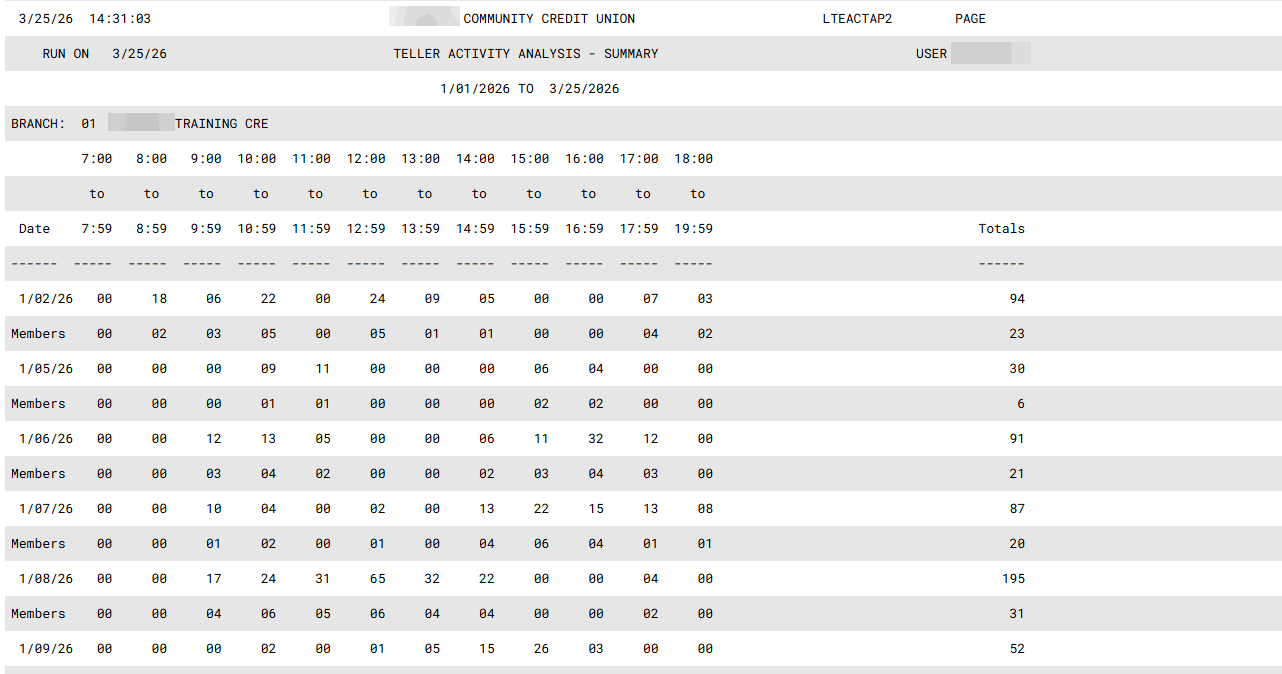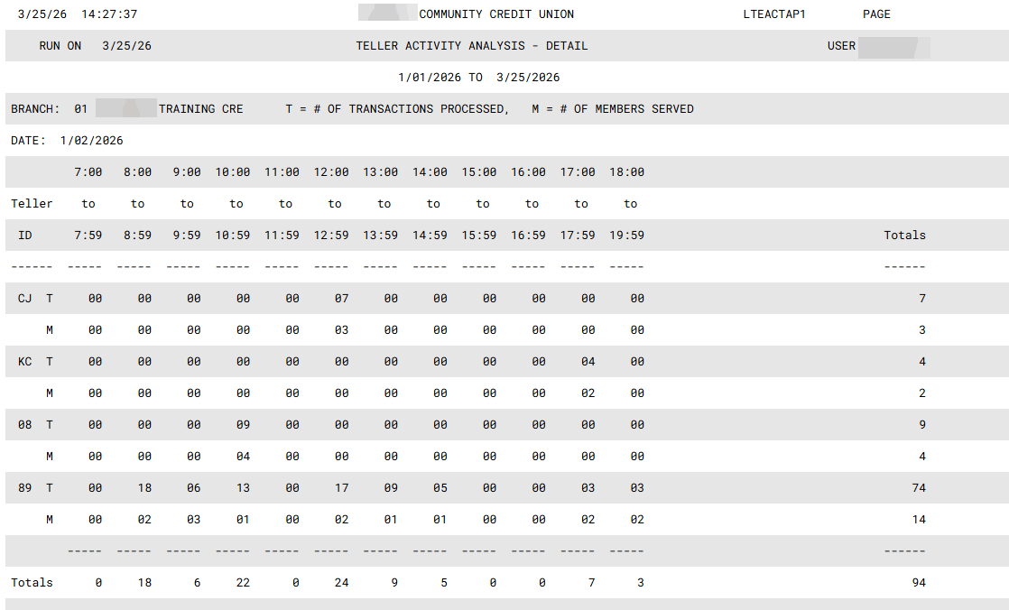 This report can be pulled at any time to analyze teller activity for a certain period of time. Like the daily report, this report counts audit key transactions—transactions that hit the teller drawer. This report does NOT show any transactions that do not affect the teller drawer (such as transfers using Proc Code “T” or corporate check/money order withdrawals).