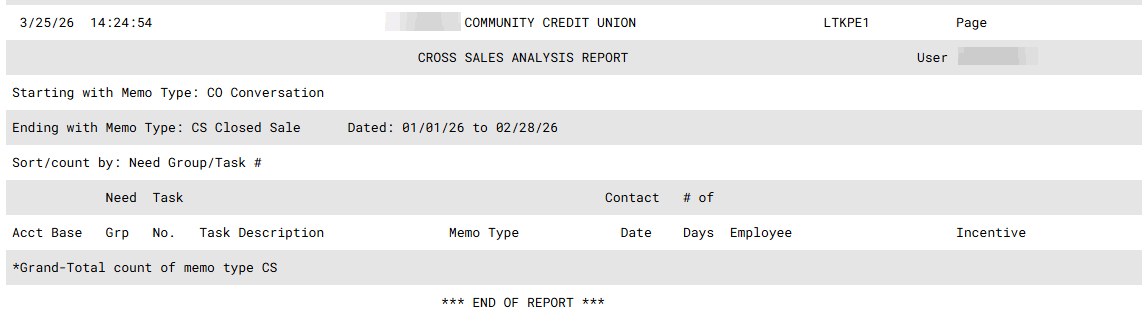Need Group/Task # (1) - the data will be sorted by the conversation Need Group first and then by Task. If a Task # is entered in the field below, you must select this sort option. You can, however, leave the Task # field below blank and use this option if you wish to view all of the lending group tasks. After this initial grouping, the data will then also be sorted by account base. Starting Point Branch/Employee (2) - the data will be sorted first by the employee branch (based on vault # from the employee ID record) and then by the employee ID who entered the “starting point” Memo Type entry on the Sales Tracker, then by Need Group/Task and finally by account base. Ending Point Branch/Employee (3) - the data will be sorted first by the employee branch (based on vault # from the employee ID record), then by the employee who entered the “ending point” Memo Type entry on the Sales Tracker, then by Need Group/Task and finally by account base. |