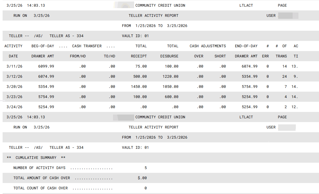 LTLACT-01 Teller Activity Report 5673 LTLACT |